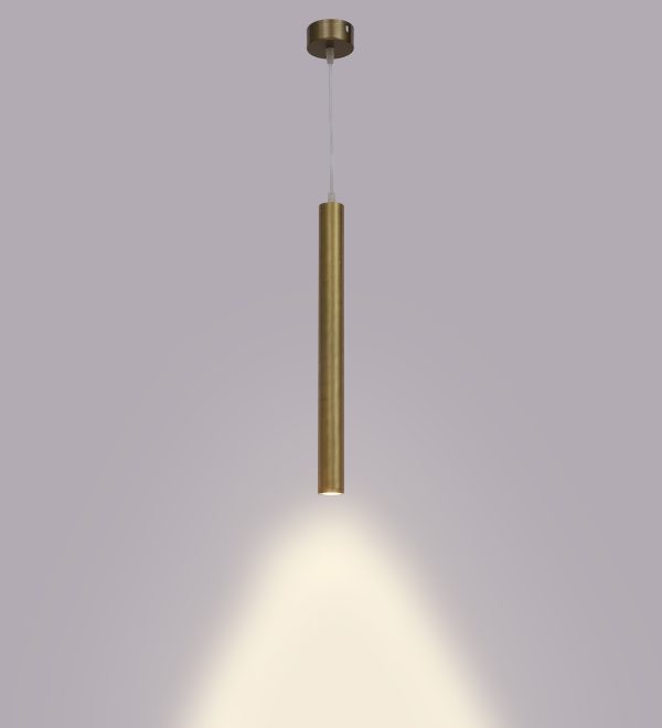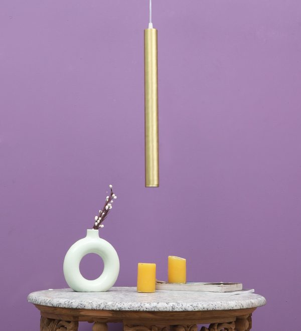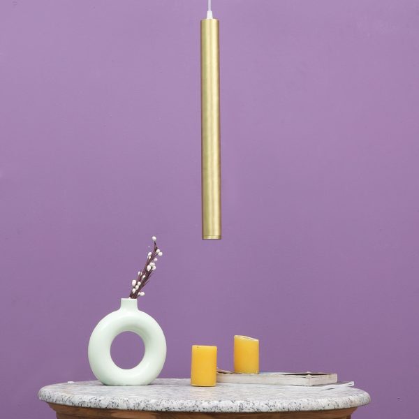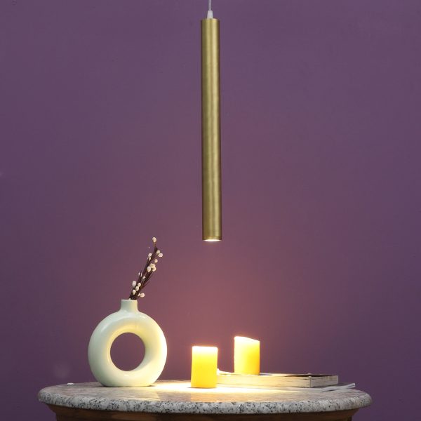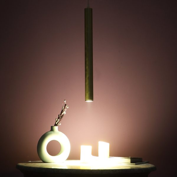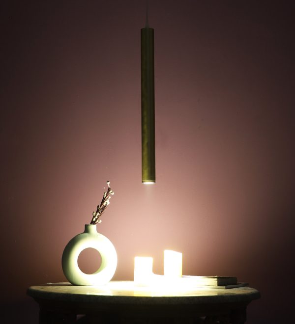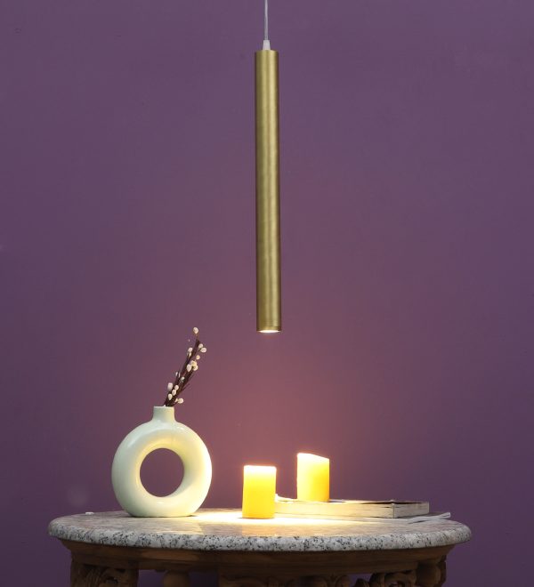Gold finish, sleek, modern, 12 watt LED hanging light having top branded LED and driver warm white (yellow) light output The suspension can be adjusted at time of installation to the desired height. Can be made available in a cluster of multiple quantities with round, square or rectangular base as per requirement . Application includes both residential and commercial premises wherever it matches with your interiors. Can be customized as per requirement in terms of finish, wattage, height, diameter.