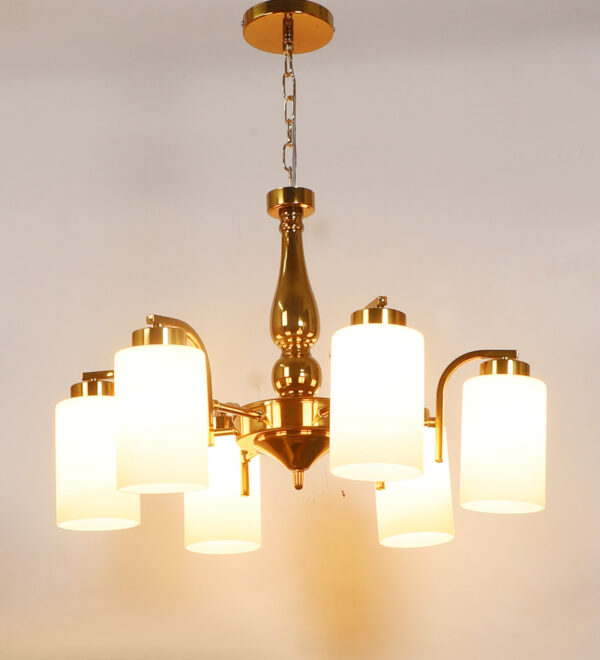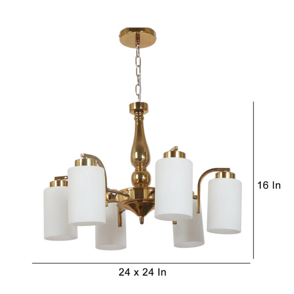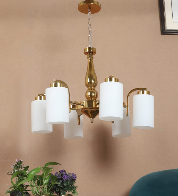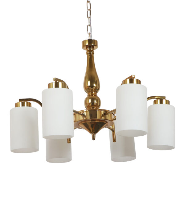 Gold finish chandelier having six lights. The suspension can be adjusted at time of installation to the desired height. It is maintenance free, it is easy to remove glasses and wash them. Comes with an E27 holder. Can be customized as per requirement. Other sizes can be made as per requirement. LAMP NOT INCLUDED.