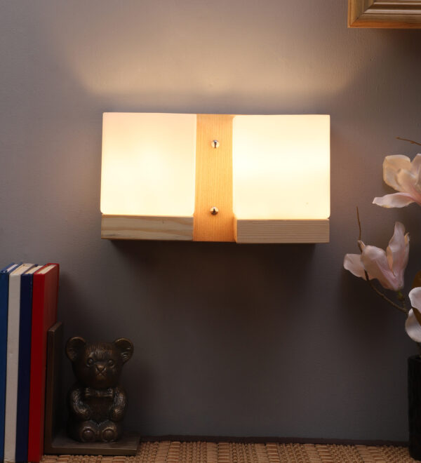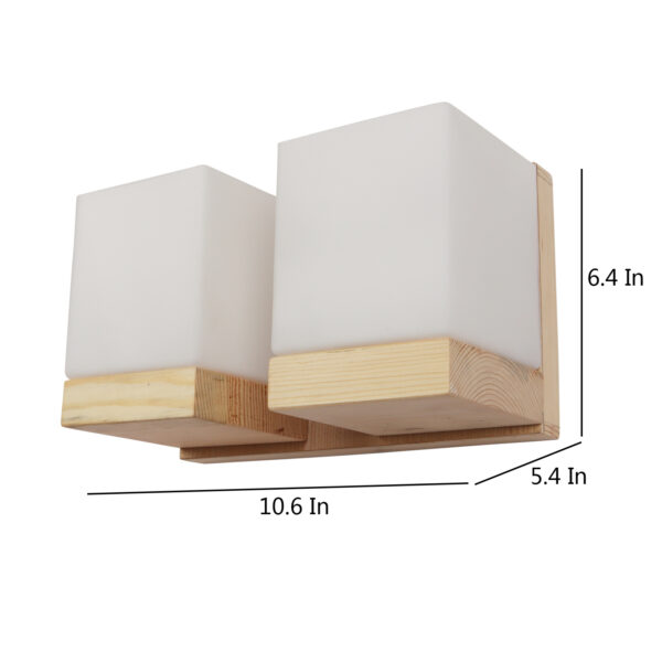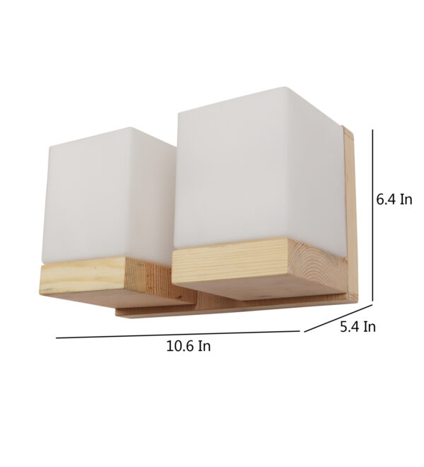 Modern brown (wood) finish double wall light made of wood, with square cubical white glasses. It is maintenance free, easy to remove glass and wash it, comes with an E27 holder, only the change of lamp is required, which is available locally everywhere. You can of course swap out the bulb for one that is dimmable, has a higher light output or a different color temperature. Application includes both residential and commercial premises wherever it matches with your interiors. Matching single wall light code WL2603. Can be customized as per requirement in case of bulk quantities. It is one of the top selling product in our catalogue. Lamp not included.