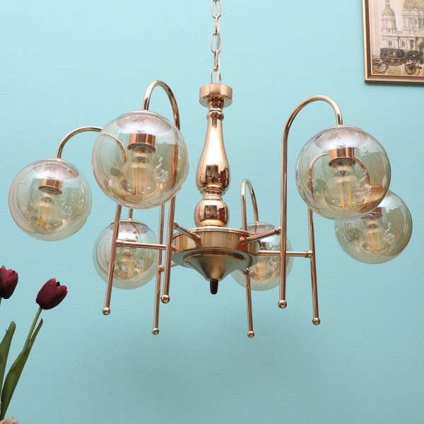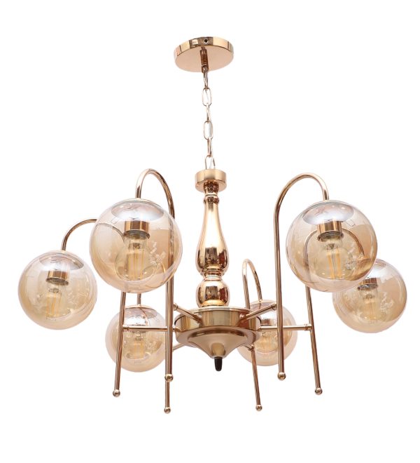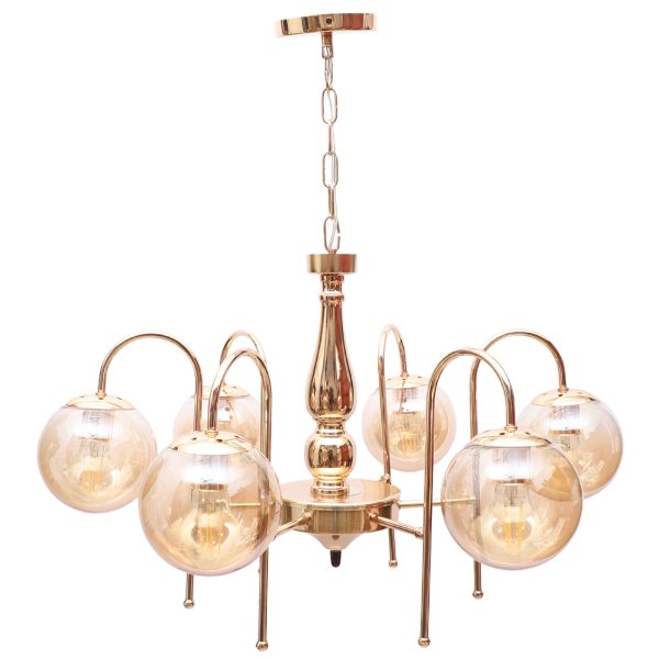Gold finish chandellier having six lights.The suspension can be adjusted at time of installation to the desired height. It is maintenance free, it is easy to remove glasses and wash them. Comes with an E27 holder.Can be customized as per requirement even for small quantities. Other sizes can be made as per reruirement. LAMP NOT INCLUDED.