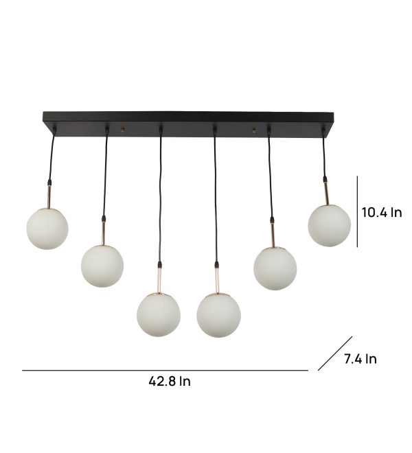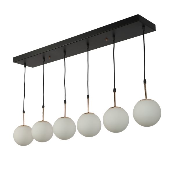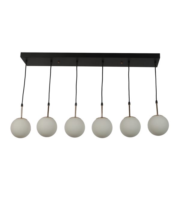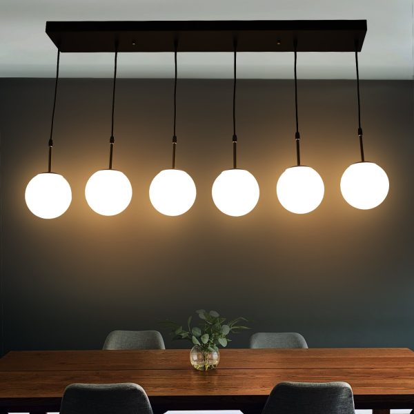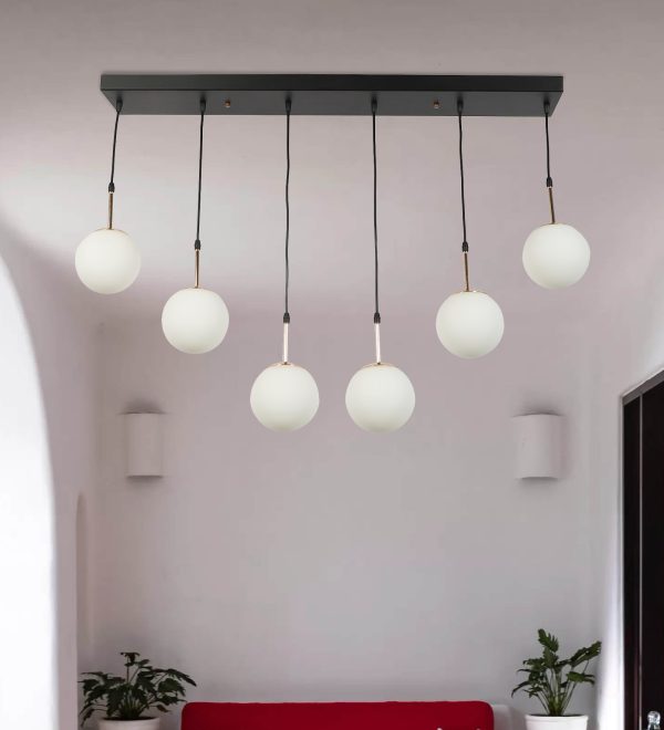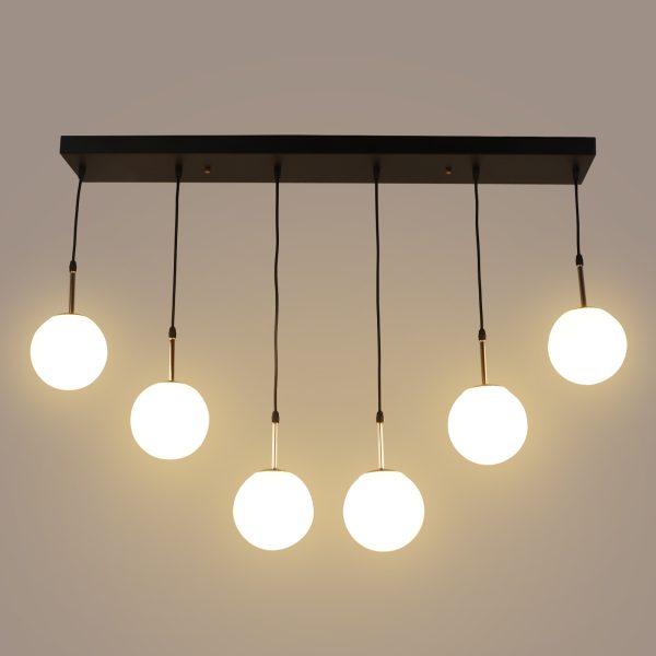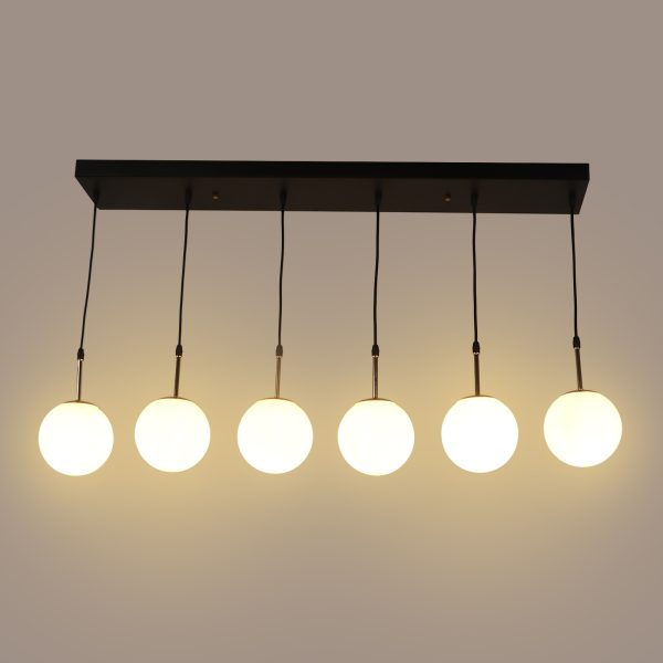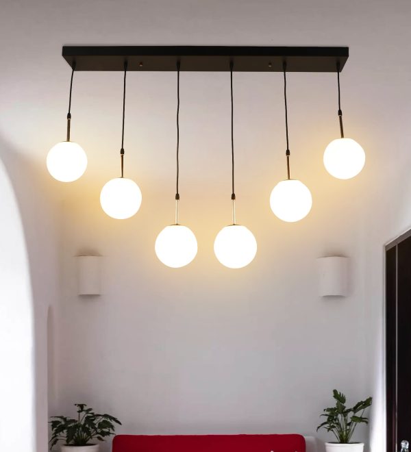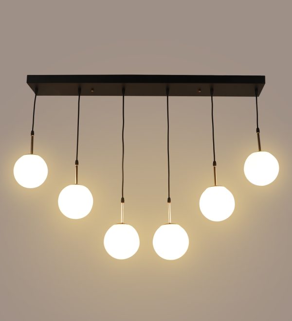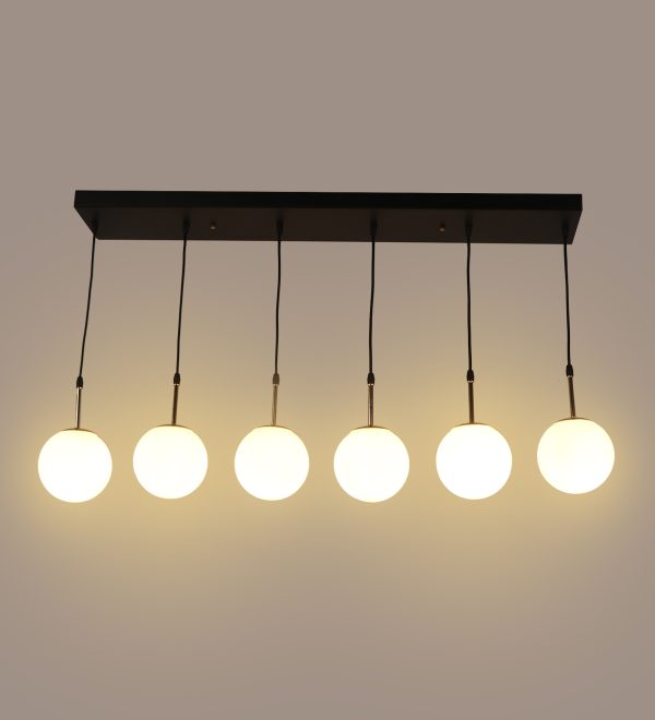 Rectangular hanging light having six lamps. Can be customised as per requirement in terms height, number of lamps, finish, shade colour. LAMPS NOT INCLUDED.