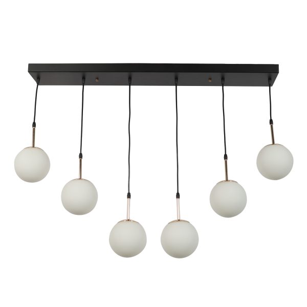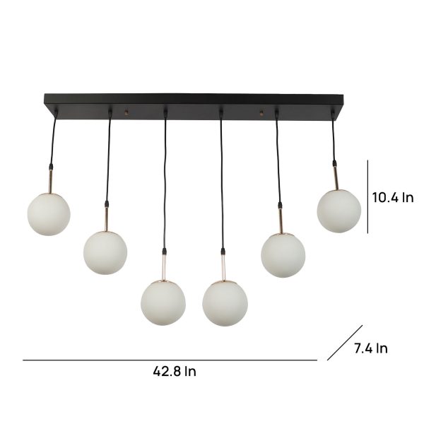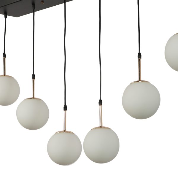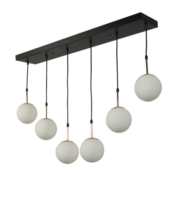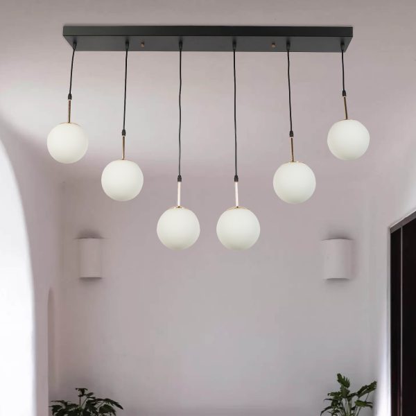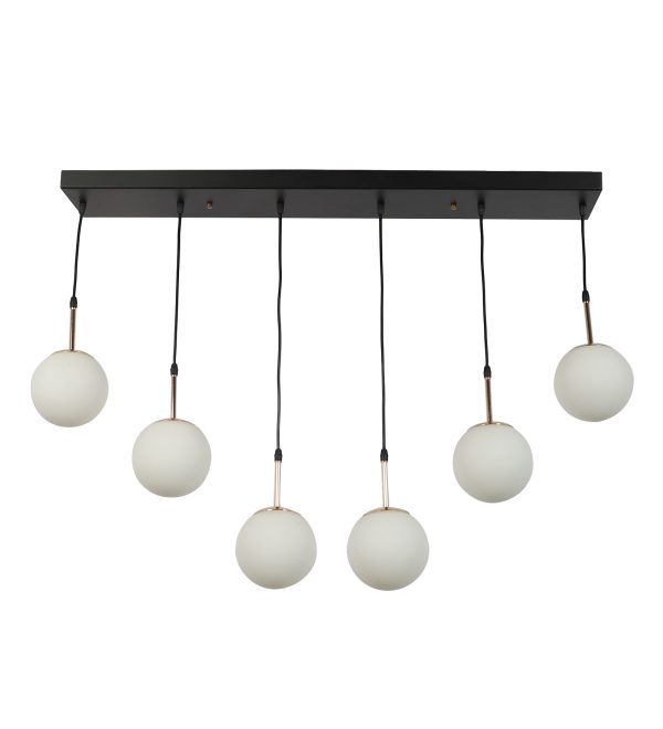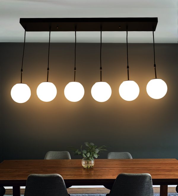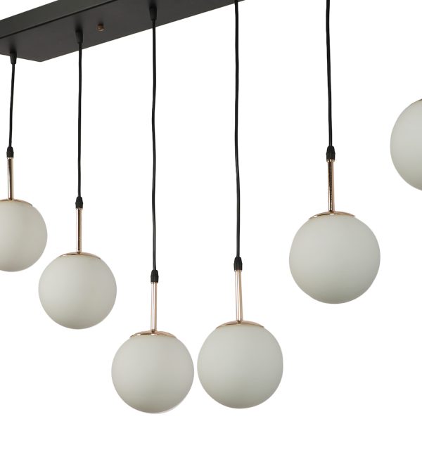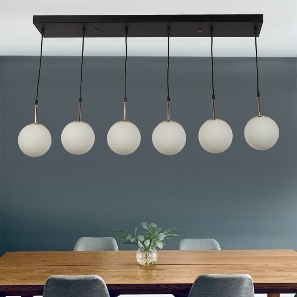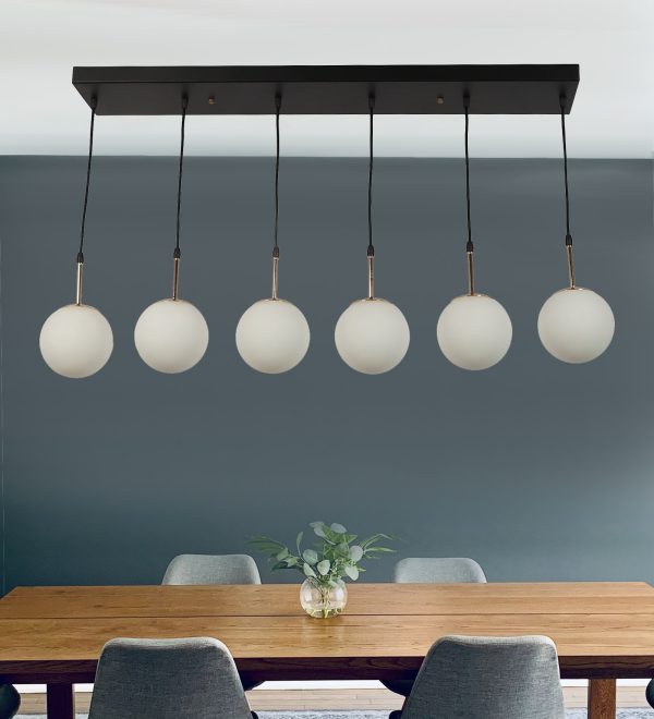 Rectangular hanging light having six lamps. Can be customised as per requirement in terms height, number of lamps, finish, shade colour. LAMPS NOT INCLUDED.
