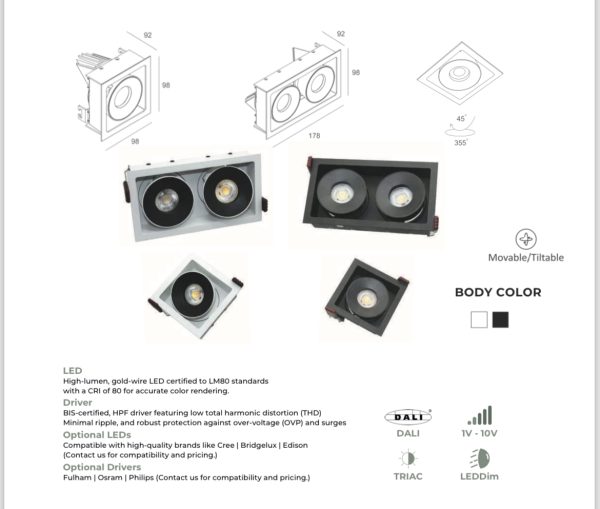 LEARC premium 2X12 watt movable and tiltable LED down light white finish with top branded LED and Driver EP7102