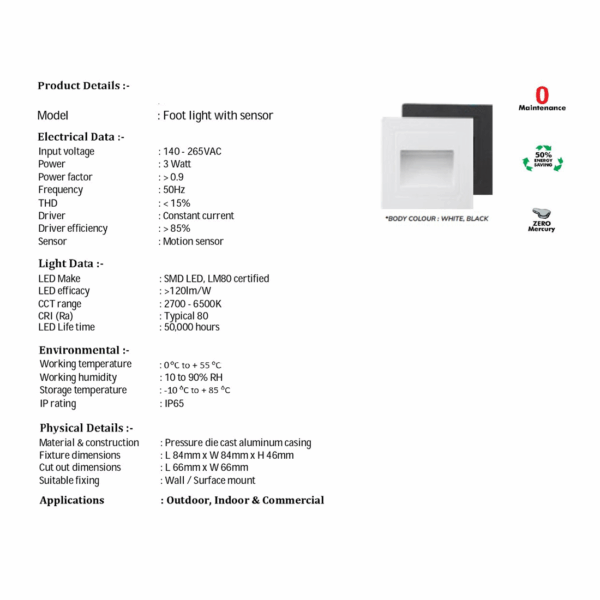 SUPERSCAPE premium aluminium white finish 3 watt IP65 motion sensor foot light concealed for outdoor and indoor.
